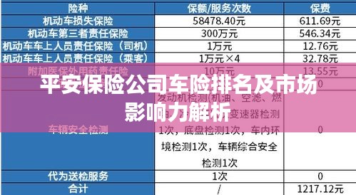 平安保险公司在车险领域的排名名列前茅,具有强大的市场影响力,其优秀的服务质量、丰富的产品线、合理的保费价格和快速的理赔服务,使其赢得了广大车主的信赖,随着汽车市场的不断发展,平安保险公司将继续发挥其优势,为广大车主提供更优质的服务和产品。