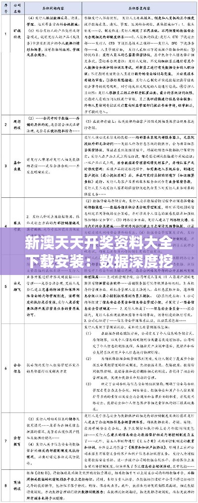 综上所述,“新澳天天开奖资料大全下载安装:数据深度挖掘指南,不止于数字”提供了一种全面而深入的分析方法,帮助我们挖掘和利用各种领域的数据。通过数据挖掘技术,我们可以发现数据背后的模式和趋势,并为决策提供支持。同时,我们也需要注意数据挖掘的伦理和隐私问题,确保数据的合法和安全使用。
