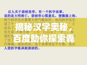 随着技术的不断进步,搜索引擎将会变得更加智能,为我们提供更准确、更全面的知识,我们还可以期待更多的汉字学习工具和资源,帮助我们更好地学习和了解汉字,让我们一起走进汉字的神秘世界,探索更多未知的奥秘,传承和发扬中华民族的优秀文化。