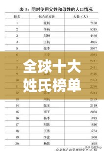 在全球化的今天,姓氏作为人类文化的重要组成部分,其分布和排名反映了人口迁移、历史演变和社会变迁的诸多因素,本文将为您揭晓全球前十名的姓氏排名,并探讨这些姓氏背后的文化意义。